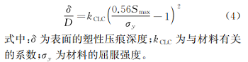 由圖4可知,S1涂層和M2涂層的平均壓痕深度分別為3.12,3.29μm,滿足軸承的靜載荷承載能力。然而,在第3次和第4次測(cè)試過(guò)程中,M2涂層的壓痕深度均超過(guò)3.5μm,分別為3.57,3.51μm。S1涂層的壓痕深度都低于3.5μm,說(shuō)明與M2涂層相比,S1涂層表現(xiàn)出更加穩(wěn)定且優(yōu)異的抗塑性變形能力。一般只有當(dāng)靜載荷超過(guò)軸承表面的屈服強(qiáng)度時(shí),其表面才會(huì)發(fā)生塑性變形,從而留下永久壓痕。LAI等通過(guò)有限元模擬等方法建立了軸承表面塑性壓痕深度的預(yù)測(cè)模型,如下: