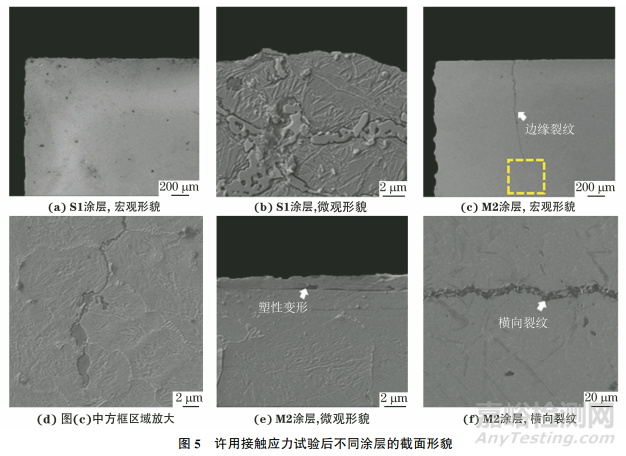 由圖5可見,許用接觸應(yīng)力試驗(yàn)后,S1涂層中不存在裂紋,而M2涂層中存在橫向裂紋和邊緣裂紋,且裂紋主要沿晶界擴(kuò)展并止于馬氏體之中。這是由于施加的靜載荷超過(guò)M2涂層的屈服強(qiáng)度,使涂層產(chǎn)生塑性流動(dòng),而塑性流動(dòng)一般以拉應(yīng)力的形式對(duì)靠近基體處涂層的亞表面及涂層的邊緣造成損傷,從而產(chǎn)生裂紋。M2涂層的屈服強(qiáng)度與塑性均低于S1涂層,因此僅在M2涂層中發(fā)現(xiàn)裂紋。在接觸應(yīng)力的作用下,M2涂層的表面出現(xiàn)由塑性變形引起的層狀撕裂,其中塑性變形區(qū)域的深度超過(guò)3μm。然而S1涂層表面未觀察到明顯的塑性變形,這主要是由于S1涂層中含有大量尺寸較大的共晶碳化物,當(dāng)承受較大的接觸應(yīng)力時(shí),大塊的共晶碳化物可以有效支撐涂層基體組織,從而防止其發(fā)生塑性變形。與S1涂層相比,M2涂層中共晶碳化物的含量較低,且尺寸細(xì)小,不能有效抵御涂層基體的塑性變形,因此涂層表面發(fā)生層狀撕裂。