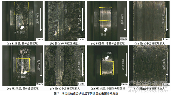 S1涂層的平均滾動(dòng)接觸疲勞壽命為 2.66×107周次,是M2涂層(1.30×107周次)的2倍。由圖7可知,S1涂層和M2涂層的疲勞失效形式均主要為整體分層,大面積的涂層從基體表面剝落,其中剝落區(qū)域呈近橢圓形狀,其長(zhǎng)軸平行于滾動(dòng)方向,而短軸垂直于滾動(dòng)方向。該現(xiàn)象的產(chǎn)生主要是由于在循環(huán)載荷的作用下涂層與基體界面處產(chǎn)生較大的剪切應(yīng)力,造成裂紋在界面處萌生與擴(kuò)展,最后導(dǎo)致涂層與基體分離。S1涂層表面非整體分層區(qū)域還存在輕微的磨損,表面發(fā)現(xiàn)少量淺磨痕,未觀察到麻點(diǎn)、剝落坑等疲勞失效特征。與S1涂層相比,M2涂層表面存在明顯的塑性變形痕跡以及剝落坑,表明M2涂層除了發(fā)生整體分層失效外,還發(fā)生點(diǎn)蝕及剝落失效。