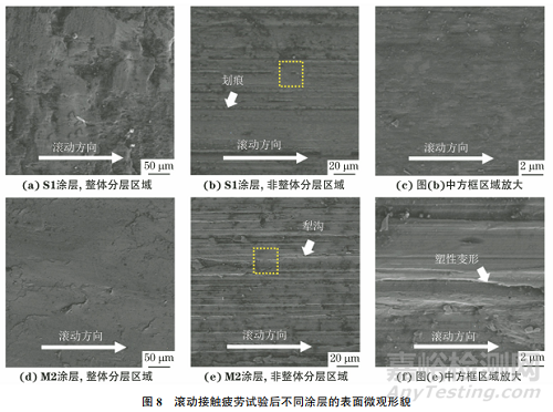 由圖8可見:M2涂層整體分層區(qū)域底部的基體表面相對(duì)平坦,存在少量表面裂紋及較淺的起皮,表明在剪切應(yīng)力作用下大塊的涂層從基體表面直接剝落,涂層與基體之間的結(jié)合強(qiáng)度相對(duì)較低;S1涂層整體分層區(qū)域底部的基體表面存在大量的黏附剝離塊,形成層狀形貌,表明涂層與基體之間的結(jié)合強(qiáng)度較高。S1涂層非整體分層區(qū)域相對(duì)光滑,表面只有少量輕微的磨削紋理。與S1涂層相比,M2涂層表面磨削紋理數(shù)量增多,深度增大,同時(shí)表面存在明顯的塑性變形痕跡。產(chǎn)生該現(xiàn)象的原因主要與涂層表面的硬度有關(guān)。S1涂層表面的硬度接近900HV,M2涂層的表面硬度約為800HV,而滾動(dòng)接觸疲勞的對(duì)磨試樣的表面硬度約為830HV,因此試驗(yàn)后M2涂層表面存在較深的磨削紋理,而S1涂層表面的磨削紋理較淺。