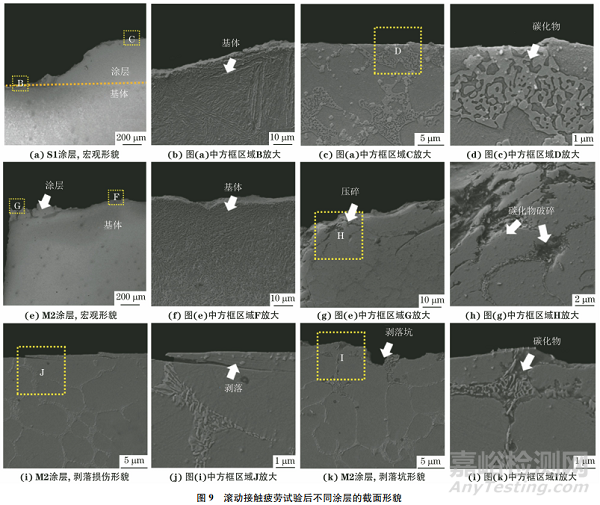 涂層表面的高硬度可以有效地抵抗疲勞循環(huán)造成的表面損傷,并在疲勞載荷的重載下改善涂層的滾動(dòng)接觸疲勞性能。由圖9可知,S1涂層剝落坑中僅發(fā)現(xiàn)基體組織,表明涂層與基體之間發(fā)生整體分層,而未從基體表面剝落的涂層中沒(méi)有出現(xiàn)表面塌陷及疲勞裂紋。M2涂層剝落坑的微觀形貌與S1涂層相似,在剝落坑中僅存在基體組織,說(shuō)明涂層與基體間發(fā)生整體分層;在未完全剝落的M2涂層中出現(xiàn)涂層壓碎、表面坍塌及疲勞裂紋等現(xiàn)象。M2涂層中增強(qiáng)相含量較少、尺寸較小,不能作為強(qiáng)化骨架有效支撐馬氏體基體,因此涂層在疲勞重載下發(fā)生塌陷。此外,由于滾動(dòng)接觸疲勞的接觸應(yīng)力較大,而M2涂層的硬度較低,因此滾動(dòng)接觸疲勞試驗(yàn)后涂層截面中存在明顯的塑性變形、表面裂紋和起皮以及剝落損傷。與M2涂層相比,S1涂層中大量的大尺寸共晶增強(qiáng)相能夠有效支撐馬氏體基體,防止其在疲勞載荷下發(fā)生坍塌,因此S1涂層表現(xiàn)出優(yōu)異的滾動(dòng)接觸疲勞性能,未觀察到明顯的塑性變形、裂紋及剝落等現(xiàn)象。
