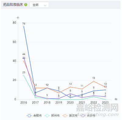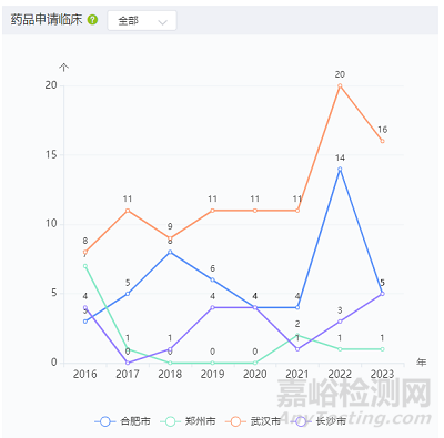 從藥品申請臨床看,2016年至2023年,合肥市、鄭州市、武漢市、長沙市的藥品申請臨床數(shù)量總數(shù)分別為49個、12個、97個、22個。對2016年-2023年數(shù)據(jù)求和,在全國所有城市中,合肥市排 22 名,鄭州市排 50 名,武漢市排 14 名,長沙市排 37 名。
