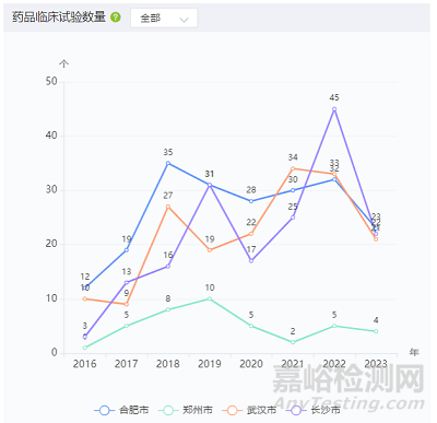從藥品臨床實驗數(shù)量看,2016年至2023年,合肥市、鄭州市、武漢市、長沙市的藥品臨床試驗總數(shù)分別為210個、40個、175個、172個。對2016年-2023年數(shù)據(jù)求和,在全國所有城市中,合肥市排 17 名,鄭州市排 51 名,武漢市排 18 名,長沙市排 19 名。
