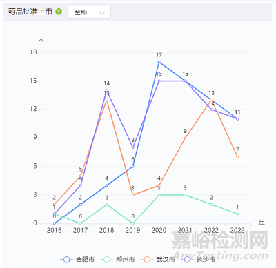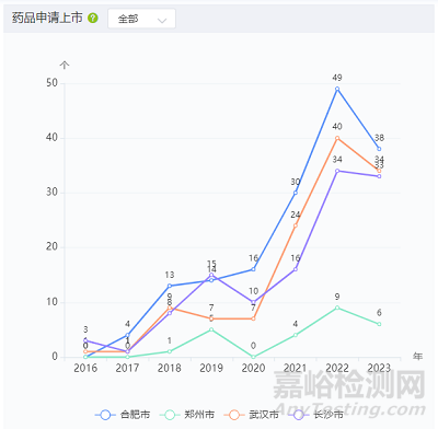 從藥品申請上市數(shù)量看,從2016年至2023年,合肥市、鄭州市、武漢市、長沙市的藥品申請上市總數(shù)分別為164個、25個、123個、120個。對2016年-2023年數(shù)據(jù)求和,在全國所有城市中,合肥市排 13 名,鄭州市排 61 名,武漢市排 18 名,長沙市排 19 名。