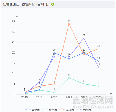 從仿制藥通過一致性評價(含視同)看,2016年至2023年,合肥市、鄭州市、武漢市、長沙市的仿制藥通過一致性評價總數(shù)分別為76個、20個、85個、82個。對2016年-2023年數(shù)據(jù)求和,在全國所有城市中,合肥市排 29 名,鄭州市排 67 名,武漢市排 24 名,長沙市排 26 名。