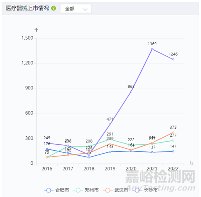 從器械上市情況看,2016年至2022年,合肥市、鄭州市、武漢市、長沙市的醫(yī)療器械上市總數(shù)分別為954個、1518個、1332個、4517個。對2016年-2023年數(shù)據(jù)求和,在全國所有城市中,合肥市排 26 名,鄭州市排 14 名,武漢市排 19 名,長沙市排 3 名。
