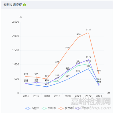 從專利發(fā)明授權看,2016年至2023年,合肥市、鄭州市、武漢市、長沙市的專利發(fā)明授權總數(shù)分別為3504個、4639個、8907個、4899個。對2016年-2023年數(shù)據(jù)求和,在全國所有城市中,合肥市排 20 名,鄭州市排 17 名,武漢市排 7 名,長沙市排 16 名。