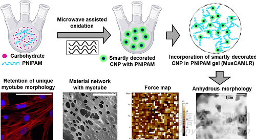 通過微波輔助氧化將碳納米顆粒和PNIPAM水凝膠結(jié)合起來,產(chǎn)生了MusCAMLR,它在生理溫度下提供結(jié)構(gòu)各向異性,類似于正常的骨骼肌。