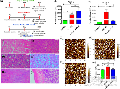 在應(yīng)用MusCAMLR之前,第2組(DOMS組)和第3組(MusCAMLR治療組)的肌肉損傷在誘導后36小時,血清肌酸激酶水平明顯上升(圖2b)。據(jù)觀察,在肱三頭肌肌肉內(nèi)注射MusCAMLR后,在應(yīng)用后72小時內(nèi),即108小時的時間點,血清肌酸激酶水平得到了恢復(圖2c)。在解剖動物進行染色切片觀察后,并未發(fā)現(xiàn)心臟、肝臟、肺、腎臟、脾臟和腸道有毒性跡象、免疫激活和其他組織的不良影響(圖2d-i),接近于DOMS組,表明材料具有良好的生物相容性。對健康組、DOMS組和MusCAMLR治療組的肌肉組織的力圖數(shù)據(jù)分析(圖2j-i),顯示DOMS組肱三頭肌肌肉的組織硬度明顯增加,在MusCAMLR治療后72小時內(nèi)降低到正常水平。