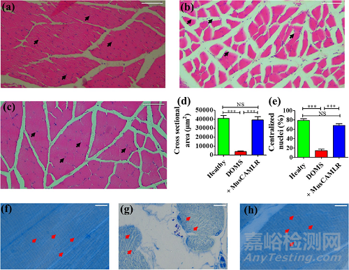 此外,研究團隊還對骨骼肌的完整性進行了檢測。發(fā)現(xiàn)DOMS組受損肌肉的橫截面積(圖3d)和集中核的百分比(圖3e)都明顯減少,這意味著肌肉發(fā)生了萎縮。而注射了MusCAMLR的實驗組,這兩項數(shù)據(jù)基本與正常組一致。為了評估肌節(jié)的Z線,對肱三頭肌組織使用甲苯胺藍染色。健康的肌節(jié)間的界限十分明顯(圖3f),而DOMS組由于機械損傷,其界限被破壞和擴散,表明Z盤被破壞(圖3g)。注射了MusCAMLR的實驗組的肌肉結(jié)構(gòu)整體上趨于完整(圖3h),表明MusCAMLR對于恢復骨骼肌的結(jié)構(gòu)完整有一定的作用。