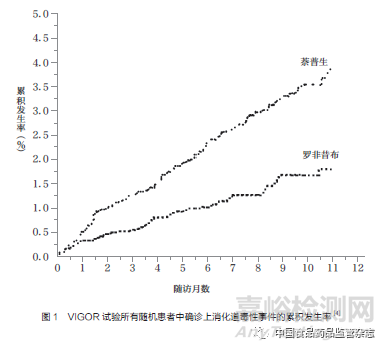 為了促進(jìn)市場(chǎng)推廣,默克公司于1999年啟動(dòng)了5個(gè)針對(duì)萬絡(luò)的大型上市后安全性驗(yàn)證研究,其中萬絡(luò)胃腸道安全性研究(Vioxx Gastrointestinal Outcomes Research,VIGOR)率先完成。VIGOR試驗(yàn)招募了8076名至少50歲(或至少40歲并接受長(zhǎng)期糖皮質(zhì)激素治療)的類風(fēng)濕關(guān)節(jié)炎患者[4],其中4047人被分配接受每天50mg的羅非昔布,4029人被分配接受每天1000mg的萘普生(非甾體抗炎藥),主要終點(diǎn)是確認(rèn)臨床上的上消化道事件(包括胃十二指腸蠕動(dòng)或梗阻、上消化道出血和有癥狀的胃十二指腸潰瘍)。