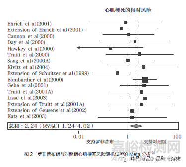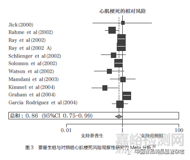 2004年12月,《柳葉刀》雜志(The Lancet)發(fā)表了萬絡(luò)導(dǎo)致的心血管事件累積分析,將18項(xiàng)隨機(jī)對(duì)照試驗(yàn)和11項(xiàng)觀察性研究的數(shù)據(jù)結(jié)果進(jìn)行綜合分析,證實(shí)了羅非昔布會(huì)引發(fā)心血管不良反應(yīng),且使用羅非昔布患心肌梗死的風(fēng)險(xiǎn)是對(duì)照組的2.24倍(圖2);同時(shí),萘普生的8項(xiàng)病例對(duì)照研究和3項(xiàng)回顧性隊(duì)列研究的數(shù)據(jù)匯總分析結(jié)果顯示,使用萘普生患心肌梗死的風(fēng)險(xiǎn)是對(duì)照組的0.86倍,僅有微弱的心臟保護(hù)作用(圖3),且當(dāng)分析基于與非萘普生的NSAIDs的比較時(shí),也得到了幾乎相同的結(jié)果,這無法解釋默克公司此前所宣稱的VIGOR試驗(yàn)中羅非昔布與萘普生相比心血管風(fēng)險(xiǎn)數(shù)據(jù)異常的原因[8]。
