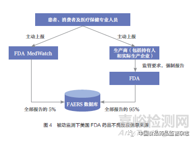 “萬絡(luò)撤市事件”發(fā)生時(shí),美國(guó)藥品不良事件報(bào)告系統(tǒng)(FDA Adverse Events Reporting System,F(xiàn)AERS)分別是強(qiáng)制企業(yè)報(bào)告體系和MedWatch自愿報(bào)告體系[又稱FDA安全信息與不良事件報(bào)告項(xiàng)目(The FDA Safety Information and Adverse Event Reporting Program)],這兩大體系是美國(guó)FDA獲得藥品不良反應(yīng)相關(guān)信息的主要來源,其中從生產(chǎn)企業(yè)處獲得藥品不良反應(yīng)數(shù)據(jù)的占比約為95%。美國(guó)FDA通過外部資源(如來自制藥企業(yè)、消費(fèi)者、患者、醫(yī)療保健專業(yè)人員等多個(gè)渠道的報(bào)告)收集藥品風(fēng)險(xiǎn)信息,這種傳統(tǒng)的安全性監(jiān)測(cè)方式被稱為“被動(dòng)監(jiān)測(cè)”[10](圖4)。而僅依靠該監(jiān)測(cè)方式的弊端在“萬絡(luò)撤市事件”中暴露無遺:企業(yè)出于自身利益考慮,未及時(shí)上報(bào)失敗的臨床試驗(yàn)數(shù)據(jù);同時(shí),美國(guó)FDA由于自身藥物警戒能力不足,缺乏主動(dòng)監(jiān)測(cè)和風(fēng)險(xiǎn)實(shí)時(shí)預(yù)警能力,導(dǎo)致其過于依賴企業(yè)遞交的風(fēng)險(xiǎn)數(shù)據(jù),從而無法及時(shí)掌握完整的藥物安全性信息來開展流行病學(xué)研究。美國(guó)FDA既缺乏充分的財(cái)力和物力自行開展研究,也缺乏對(duì)違規(guī)企業(yè)進(jìn)行處罰的法律授權(quán),面對(duì)問題束手無策。