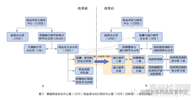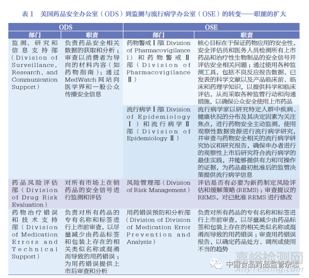 根據(jù)FDAAA新授權(quán)的職責(zé),美國(guó)FDA進(jìn)行了相應(yīng)的組織架構(gòu)調(diào)整。組織機(jī)構(gòu)改革前,ODS是FDA負(fù)責(zé)藥品不良反應(yīng)監(jiān)測(cè)的最主要部門,級(jí)別屬于二級(jí)辦公室,隸屬于藥物流行病學(xué)和統(tǒng)計(jì)學(xué)辦公室(office of pharmacoepidemiology and statistical science,OPaSS)(圖5a)。組織機(jī)構(gòu)改革后,ODS更名為OSE,并將級(jí)別從二級(jí)辦公室提升至一級(jí)辦公室,直屬CDER的中心主任辦公室(圖5b)。OSE辦公室地位的提升,不僅增強(qiáng)了與其他部門的溝通交流和話語權(quán),還擴(kuò)大了流行病學(xué)、風(fēng)險(xiǎn)評(píng)估、項(xiàng)目管理等藥品安全相關(guān)領(lǐng)域的崗位編制,擁有了更強(qiáng)大的監(jiān)管力量。機(jī)構(gòu)重組后,OSE主要負(fù)責(zé)安全信息采集、風(fēng)險(xiǎn)識(shí)別和初篩[23](表1),OND主要負(fù)責(zé)獲益及風(fēng)險(xiǎn)整合評(píng)估和監(jiān)管決策,二者協(xié)同開展獲益及風(fēng)險(xiǎn)監(jiān)測(cè)。