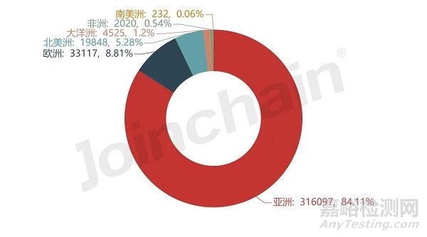 2022年度,亞洲助聽器出口貿(mào)易次數(shù)達(dá)316097次,占全球助聽器出口貿(mào)易總次數(shù)(不包括未披露出口國家的12603次)的84.1%,其次是歐洲、北美洲,出口貿(mào)易次數(shù)分別為33117次、19848次,占比分別為8.81%和5.28%。