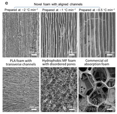 圖為三種通道寬度分別為30、90和150 µm的定向多孔泡沫,有序通道的尺寸受冷卻速率的影響,排列的多孔泡沫的通道方向與凍結(jié)方向一致。