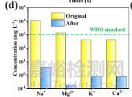 通過ICP-MS測(cè)試蒸發(fā)海水的質(zhì)量,評(píng)估水凝膠蒸發(fā)器的污水凈化能力,圖中顯示模擬海水中的主要離子(Na+、Mg2+、K+和Ca2+)減少了約3個(gè)數(shù)量級(jí),顯示出出色的脫鹽率。