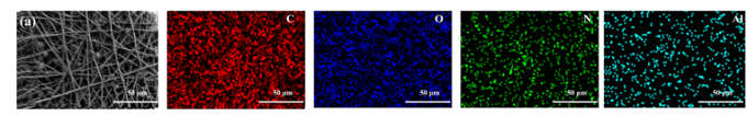 采用EDS表征研究APP膜的表面化學(xué)成分,源自PET的C和O元素PDA均勻分布在APP表面。N元素的均勻分布證明了PET膜表面存在PDA層,這可能有利于Al2O3團(tuán)簇的形成粘附在其表面。此外,還檢測(cè)到具有低原子百分比的Al元素,表明Al2O3團(tuán)簇分布均勻,在PDA/PET膜的頂表面成功組裝了Al2O3凸點(diǎn)結(jié)構(gòu)。