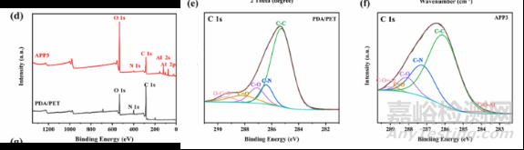 XPS的表面化學(xué)成分分析顯示,PDA/PET膜上分別在125.1 eV和76.1 eV處出現(xiàn)Al 2s和Al 2p的新特征峰,證實(shí)了Al2O3團(tuán)簇已經(jīng)附著在PDA/PET薄膜上。PDA/PET和APP3膜的C1s光譜的比較顯示PDA/PET的O–C=O、C=O,C–O、C–N和C–C分別為289.33、288.19、287.10、286.40和285.28。APP3的O–C=O、C=O,C–O、C–N、C–C和C–O–Al分別為289.07、288.63、288.09、287.23、286.10和284.00。