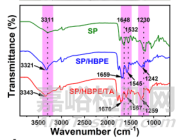 TA的引入導(dǎo)致了明顯的藍(lán)移,O–、 N–H峰值從SP的3311 cm−1移動(dòng)到SP/HBPE/TA(SP/HBPE/TA-3)的3343 cm−1,SP的1648、1532和1230 cm−1的三個(gè)峰在SP/HBPE/TA中分別移動(dòng)到1676、1567和1259 cm−1,表明SP、HBPE和TA之間存在較強(qiáng)的氫鍵相互作用。