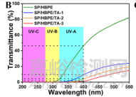 SP/HBPE/TA(SP/HBPE/TA-1,2,3)薄膜都能100%屏蔽沿線的UVB(320–275 nm)和UVC(275–200 nm)光,90%屏蔽UVA(400–320 nm)光。這種優(yōu)異的紫外線屏蔽性能有助于保護(hù)產(chǎn)品免受紫外線照射。(其中:超韌性大豆蛋白(SP)、超支化聚酯(HBPE)、單寧酸(TA))。