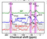 通過13C NMR光譜進(jìn)一步驗(yàn)證了強(qiáng)烈的分子間氫鍵相互作用。由蛋白質(zhì)的羰基、C-α、C-β和C-γ的共振引起的SP的173.8、55.7、30.6和25.3 ppm處的四個(gè)峰,在SP/HBPE/TA中分別移動(dòng)到171.9、53.6、29.0和23.6 ppm的較低化學(xué)位移,對(duì)應(yīng)于強(qiáng)分子間氫鍵的形成。