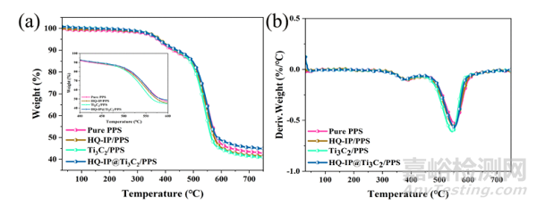 熱穩(wěn)定性性能對(duì)織物復(fù)合材料摩擦磨損性能具有重要價(jià)值,織物復(fù)合材料降解的第一階段是在300–420 ℃、 與酚醛樹脂的熱分解有關(guān),第二階段的降解溫度為440–620 ℃、 歸因于PPS纖維的分解。與純pps相比,HQ-IP@Ti3C2/PPS織物復(fù)合材料在750 ℃時(shí)剩余重量最高,為44.9%。