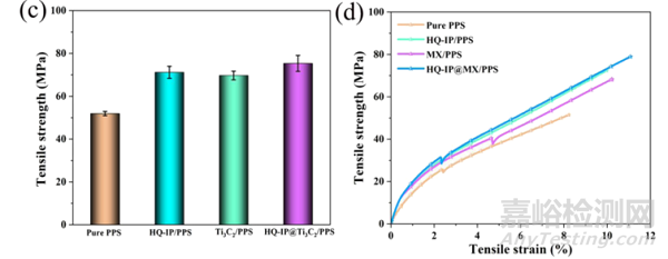 織物復(fù)合材料的拉伸強(qiáng)度和相關(guān)的應(yīng)力-應(yīng)變曲線評(píng)估PPS復(fù)合物織物的韌性和可變形性,HQ-IP@Ti3C2/PPS織物復(fù)合材料達(dá)到75.3 MPa,比原來的PPS織體復(fù)合材料(51.9 MPa)提高了45%。