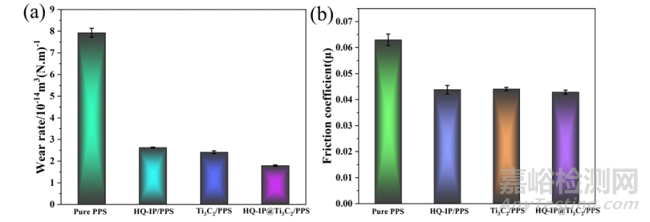 隨著納米填料的加入,織物復(fù)合材料的磨損率都有所下降DOPO-HQ-IPTS@Ti3C2Tx/PPS的磨損率為1.8x10−14 m3(N·m)−1,與純PPS織物復(fù)合物相比降低了77%。圖b顯示了織物復(fù)合材料的相應(yīng)摩擦系數(shù)。很明顯,摩擦系數(shù)的趨勢(shì)與磨損率相似。