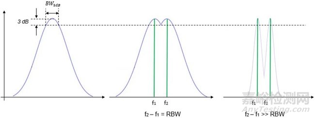 如果雙音信號(hào)頻間距遠(yuǎn)遠(yuǎn)小于中頻濾波器的帶寬,那么頻譜儀是無(wú)法“分辨”出這兩根譜線的,而是“誤認(rèn)為”是一根譜線。當(dāng)頻間距與中頻濾波器帶寬相等時(shí),頻譜儀測(cè)得的頻譜將如圖2(中)所示,通常認(rèn)為此時(shí)為可分辨的臨界點(diǎn)。如果將RBW設(shè)置得遠(yuǎn)遠(yuǎn)小于頻間距,則可以非常清晰的將兩個(gè)信號(hào)分辨出來(lái),如圖2(右)所示。