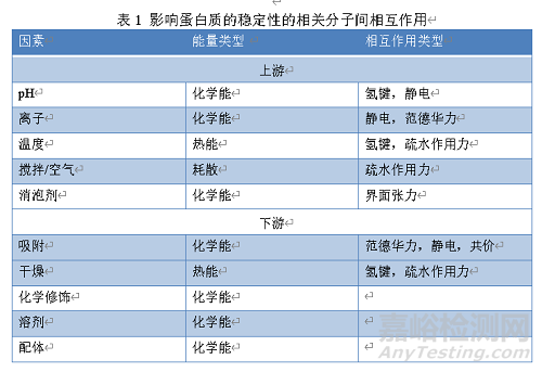 總之,蛋白質(zhì)的天然構(gòu)象是通過(guò)不同的分子內(nèi)作用力來(lái)穩(wěn)定的,如氫鍵、二硫鍵、靜電、疏水相互作用等,氫鍵對(duì)于蛋白質(zhì)的穩(wěn)定性是很關(guān)鍵的。因此,如果生產(chǎn)及儲(chǔ)存過(guò)程中產(chǎn)生的熱、化學(xué)和耗散能打破了分子內(nèi)作用力,就會(huì)導(dǎo)致蛋白展開(kāi),從而聚集。下表1列出了影響蛋白穩(wěn)定性的不同因素以及相互作用類(lèi)型。