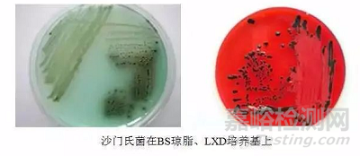 將培養(yǎng)后的TTB和SC搖勻,用接種環(huán)分別劃線接種于BS瓊脂平板和XLD瓊脂平板,或HE瓊脂平板,或沙門顯色平板,于36℃±1℃分別培養(yǎng)40h-48h或18h-24h,之后觀察各個平板上菌落特征。