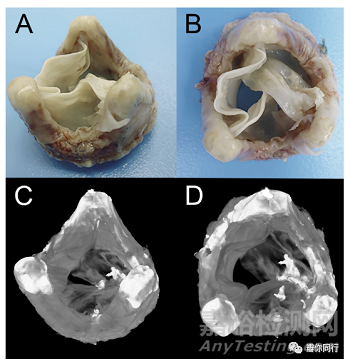 圖1移植生物心臟瓣膜有退行性改變(纖維化和鈣化跡象) (A) 流出部分(等距圖),(B) 流出部分(俯視圖),(C)流出側(cè)顯微斷層投影(等距圖),(D)流出側(cè)顯微斷層投影(俯視圖)。