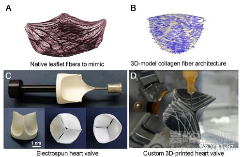 圖4、膠原纖維在天然小葉中的定位(A) (Coulter, 2019);數(shù)值模擬中的光纖定向建模(B) (Serrani, 2016);聚合物心臟瓣膜的原型制作和靜電紡絲(C) (D’amore, 2018);使用改進(jìn)的3D打印系統(tǒng)制作傳單原型(D)(庫(kù)爾特,2019年)