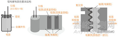 電容的結構組成可以簡單分為三部分:電極+介質+電極,以下是片狀多層陶瓷電容和鋁電解電容的基本結構示意圖:
