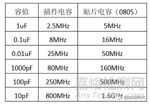 在EMC整改過程中,電容濾波是常用的手段之一,利用電容在不同頻段的頻率特性可以實現(xiàn)對電磁輻射的抑制,常用的電容諧振頻率可以參考下表: