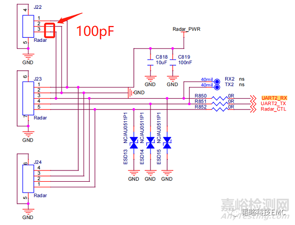 通過排查發(fā)現(xiàn)主要的輻射路徑是串口通信接口,如下:
