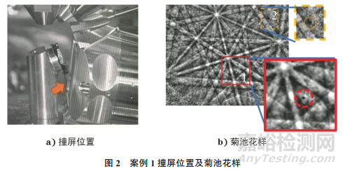 在進行EBSD表征時,需要將金屬鈦試樣的測試面拉平,即將測試面正對EBSD探測器。操作人員僅預判到試樣會旋轉一個小角度,故未退回探測器時就執(zhí)行了軟件的拉平操作。拉平操作不僅會旋轉試樣,還會使試樣進行其他方向的補償移動,甚至接近報警時探測器已被手動關閉,導致試樣迎向了探測器。因為試樣下端較突出[見圖2a)],這些偶然的疊加最終導致試樣撞擊了磷屏。電鏡的碰撞報警生效,阻止了試樣臺的進一步移動。磷屏損傷肉眼不可見,但在菊池花樣上出現(xiàn)了一個壞點[見圖2b)]。
