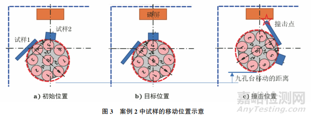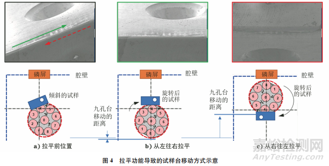 在案例2中,九孔臺的4號和5號位各有試樣1和試樣2,且試樣1的形狀比較狹長。試樣的移動位置如圖3所示。為了避免意外,測試前已將探測器退回,但未完全退回,且打開了接近報警。然而,在使用軟件拉平功能時,從右往左拉平使得馬達臺出現(xiàn)類似圖3c)的移動,即馬達臺不僅旋轉了一個較大角度,還快速迎向了磷屏。馬達臺旋轉速率很快,最終探測器的退回速率小于試樣1邊旋轉邊前進的速率,導致試樣撞擊了磷屏。損傷肉眼不可見,但是在菊池花樣上也出現(xiàn)了一個壞點。