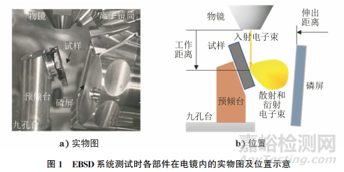 EBSD系統(tǒng)測試時通常需要大角度傾斜試樣,所以可使用放置于九孔臺上的預傾臺。使用預傾臺時,探測器、試樣及各組件的位置如圖1b)所示,可見探測器與試樣的距離非常小,有些情況下甚至只有幾個毫米,操作風險較大。