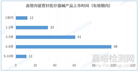 據(jù)統(tǒng)計,從產(chǎn)品進入市場的平均時間來看,在有效期內(nèi)的血管內(nèi)留置針醫(yī)療器械產(chǎn)品的上市時間在6-8年的產(chǎn)品數(shù)量最多,有98件。