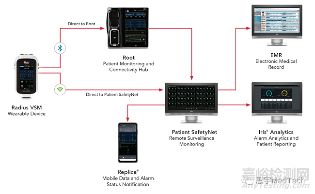 Radius VSM還可以作為患者監(jiān)控系統(tǒng)的一部分,將最新的生理數(shù)據(jù)傳輸給醫(yī)院內(nèi)的臨床醫(yī)生。例如,通過將Radius VSM的數(shù)據(jù)集成到Patient SafetyNet中,它可以擴展在醫(yī)院內(nèi)的覆蓋范圍,讓遠程監(jiān)控患者的臨床醫(yī)生可以在集中式查看站點或配備了Replica智能手機上查看連續(xù)監(jiān)測數(shù)據(jù),并從Halo ION患者評分系統(tǒng)的工作流程自動化中受益。以上功能都不會因為患者在醫(yī)院內(nèi)的位置或移動而受到影響。