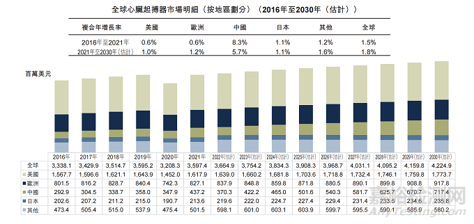 全球進(jìn)行的?臟起搏器植入?術(shù)的數(shù)量預(yù)期將由2021年的1.3百萬臺增加至2030年的1.7百萬臺,復(fù)合年增長率為3.0%。于2021年,歐洲進(jìn)行的?臟起搏器植入?術(shù)約為567,400臺,占全球所有區(qū)域市場中最多(44.8%)。預(yù)期中國的?臟起搏器植入?術(shù)增長率最高,2021年至2030年的估計(jì)復(fù)合年增長率為7.6%。下圖載列全球進(jìn)行的?臟起搏器植入?術(shù)的數(shù)量。