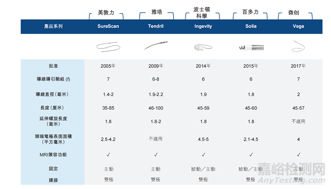 下表載列該等公司于美國、歐盟及╱或中國獲批的最新主要起搏導(dǎo)線(其連接?臟起搏器與?臟,并將電子信號輸送至?臟以供起搏)的比較: