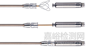 不僅如此,雅培還開發(fā)了專用的AVEIR輸送和取出導(dǎo)管,其為一種帶偏轉(zhuǎn)機(jī)構(gòu)的可操縱輸送導(dǎo)管,獨(dú)特的三環(huán)圈套結(jié)構(gòu)能夠和AVEIR進(jìn)行裝配,如下圖所示: