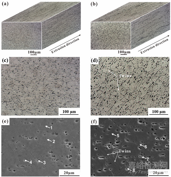 圖1:擠壓態(tài)(a,c)LX11和(b,d)LX41合金的三維光學(xué)顯微照片及其橫斷面的放大圖;擠壓態(tài)(e)LX11和(f)LX41合金的電子探針圖像