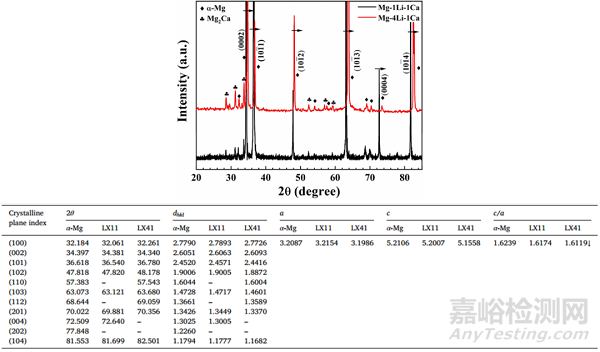 圖2:擠壓態(tài)LX11和LX41合金的XRD譜圖和c/a比