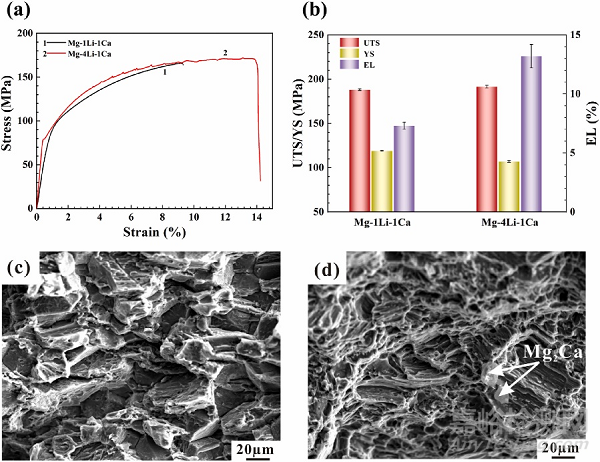 圖3:LX11和LX41合金的(a)應(yīng)力-應(yīng)變曲線和(b)UTS、YS和EL;(c)LX11和(d)LX41合金的斷口形