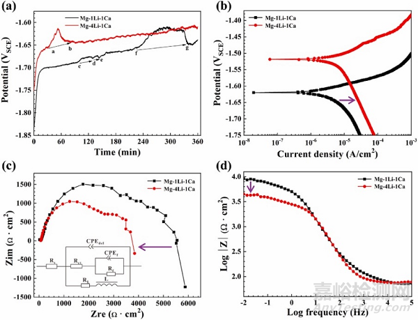 圖4:LX11和LX41合金在Hank’s溶液中的(a)開(kāi)路電位、(b)極化曲線、(c)Nyquist圖和(d)Bode圖