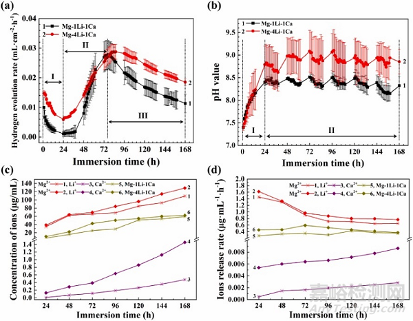 圖5:LX11和LX41合金在Hank’s溶液中浸泡168 h的(a)析氫速率、(b)pH值、(c)離子釋放總量和(d)離子釋放速率
